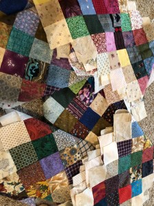 My gramma had plans for her different quilts; however, some of those plans we can’t figure out! This project we are currently working on has 7 of these strips, pictured below, and due to their layout, they cannot be sewn together without cutting the cream-colored squares in half (at least we don’t know away).