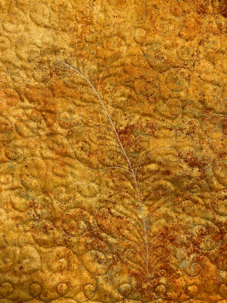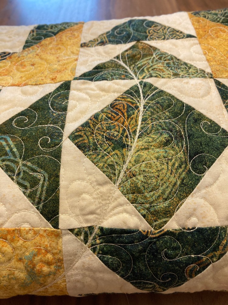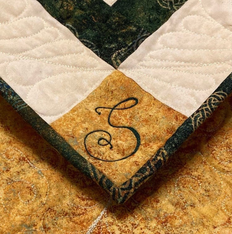 This quilt was started by my Gramma for my youngest sister, Sierra. The green and gold colors are for her High School. It was finished upon my Gramma’s death by her good friend, Sharon Thompson, and I quilted it. The main part of the quilt has feathers and swirls quilted on it. Each corner has something different. As you see in the pictures below, there are my sister’s initials and a soccer ball for her favorite sport.