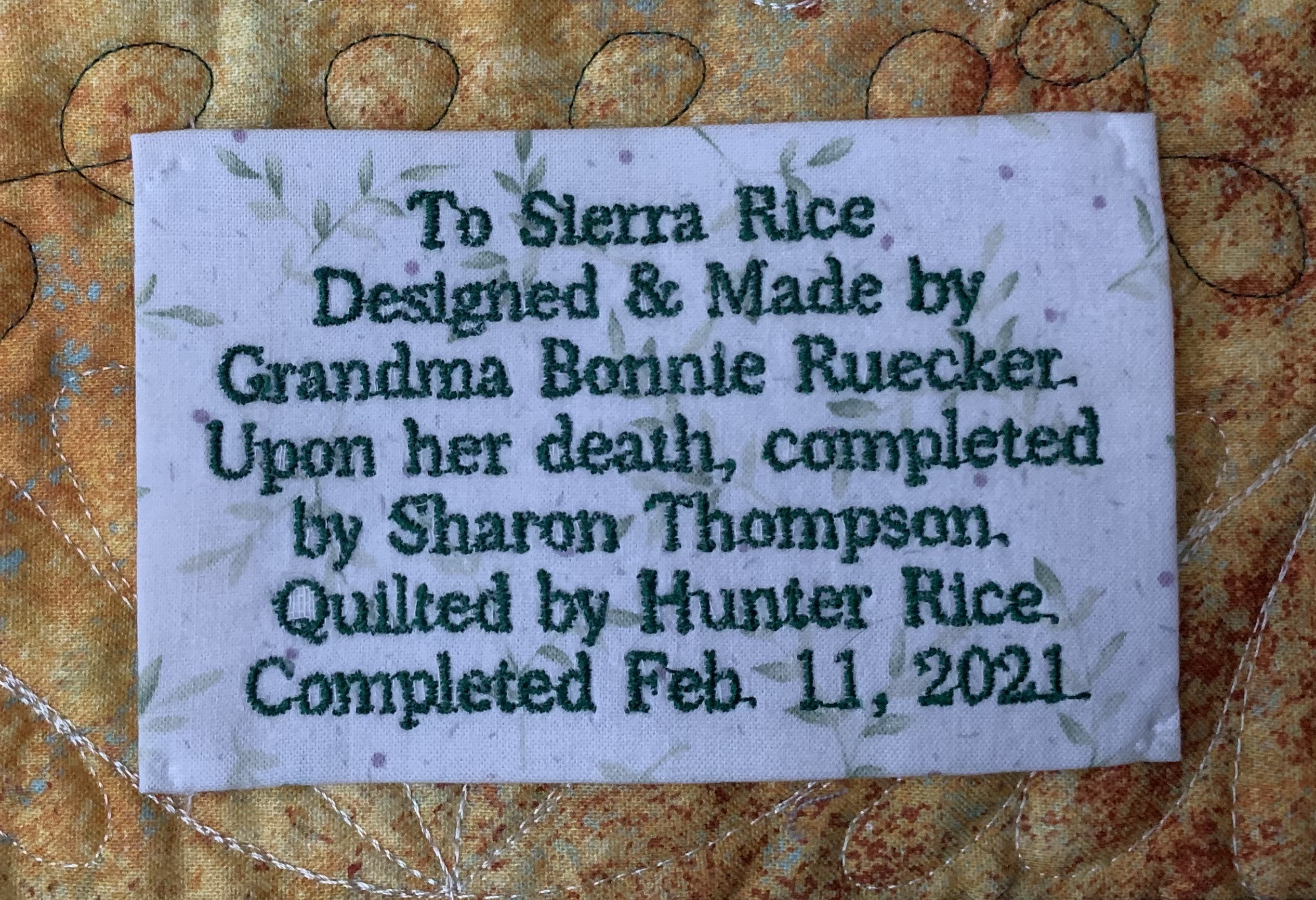 1. Thanks for sharing, Hunter, it is so beautiful, and I know your sister, Sierra, will love and treasure her special quilt started by your grandmother, Bonnie Ruecker, Sharon Thompson, and you, Hunter Rice, and I know that each stitch was made with love. Love you, Carolyn E. Elliott, Zach’s great aunt, his grandmother, Mary Alice Ezell Beauchamp’s, youngest sister.