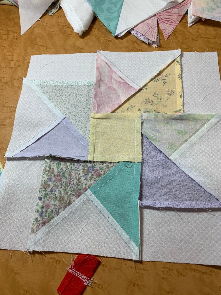 Gramma had almost all the blocks finished for this quilt; however, my mom needed to finish and make a few more blocks to have an even number. Looked simple enough… except of course we did not have a pattern. She called me asking how to do this block and I was baffled. I’ve been quilting for 16 years now, but there is still so many blocks and techniques I have never done and this was one! So we did what was necessary, we asked for help. I emailed some wise quilters I knew, and my mom sent a message on a quilters Facebook page asking if anyone could identify this block and how to do this technique. We got our answer very quickly!
