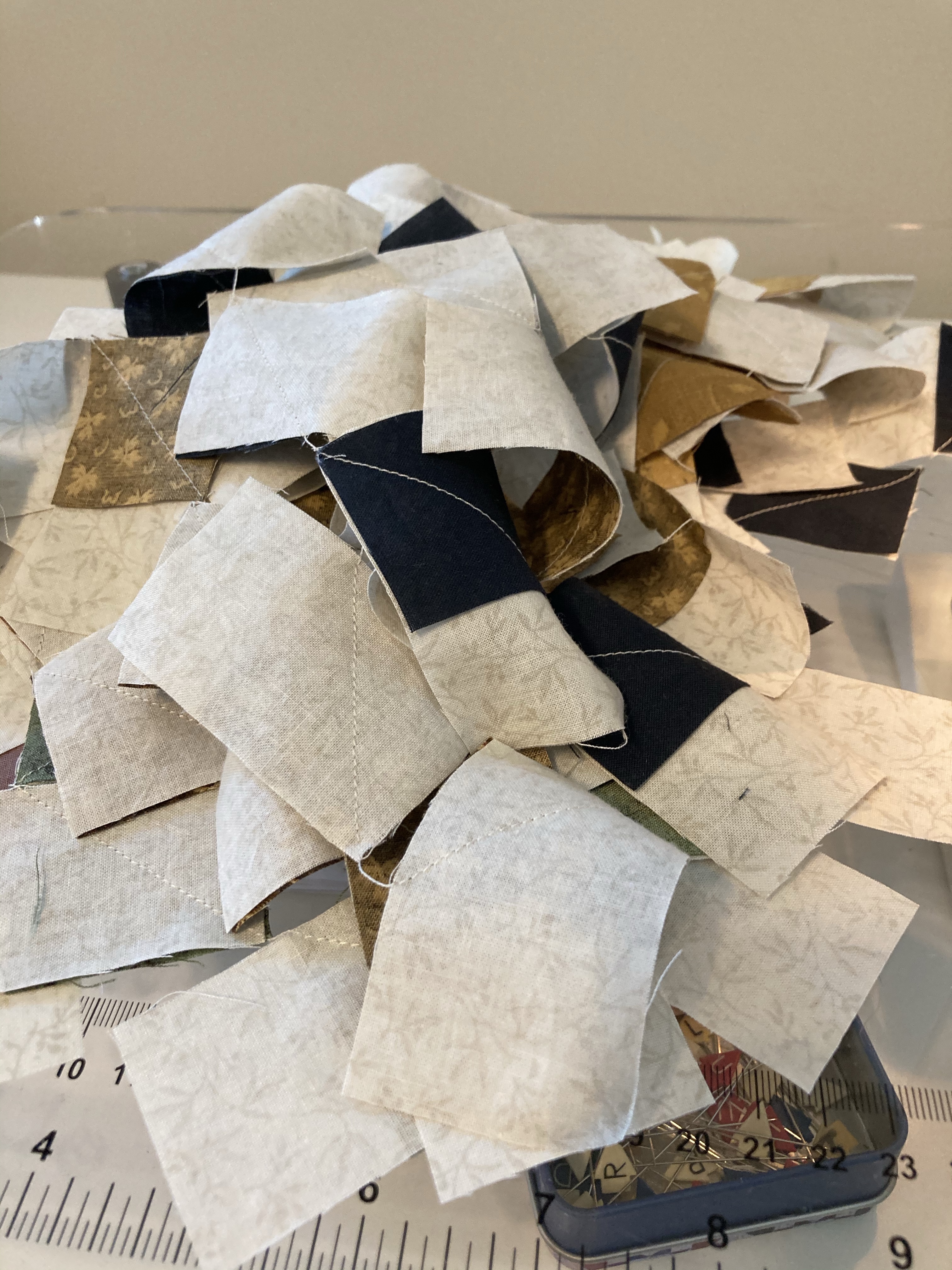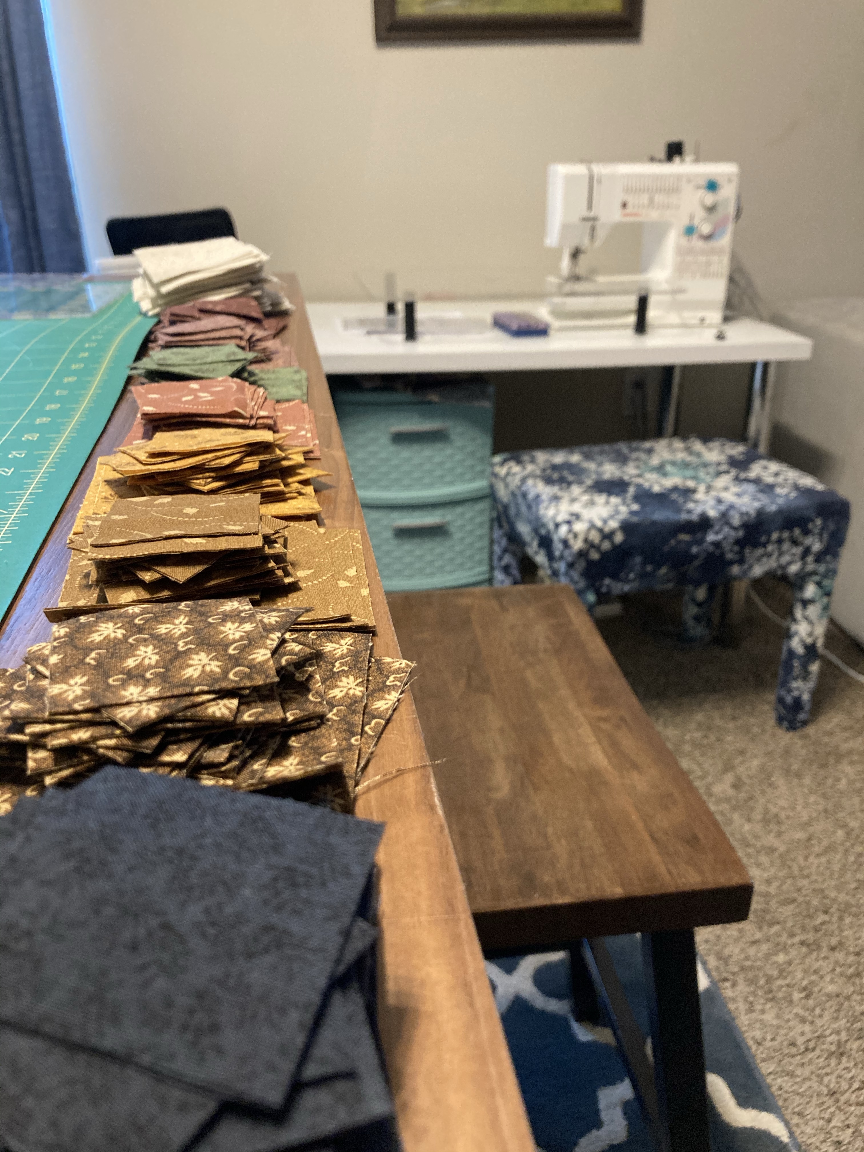 My sewing space has changed slightly since I started this quilt! I now don’t have to use the kitchen table for all my cutting which is really nice! The top right picture is all of my squares cut and ready to be sewn into stars. The top left picture is all of my half triangles and squares chain sewn together… there were a lot of stars and a lot of points. I am happy to say not very many of them were chopped off. If you are interested in this quilt block, see my A Bit of Sunday Wisdom: Star Block post.