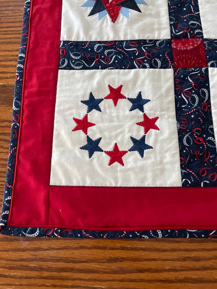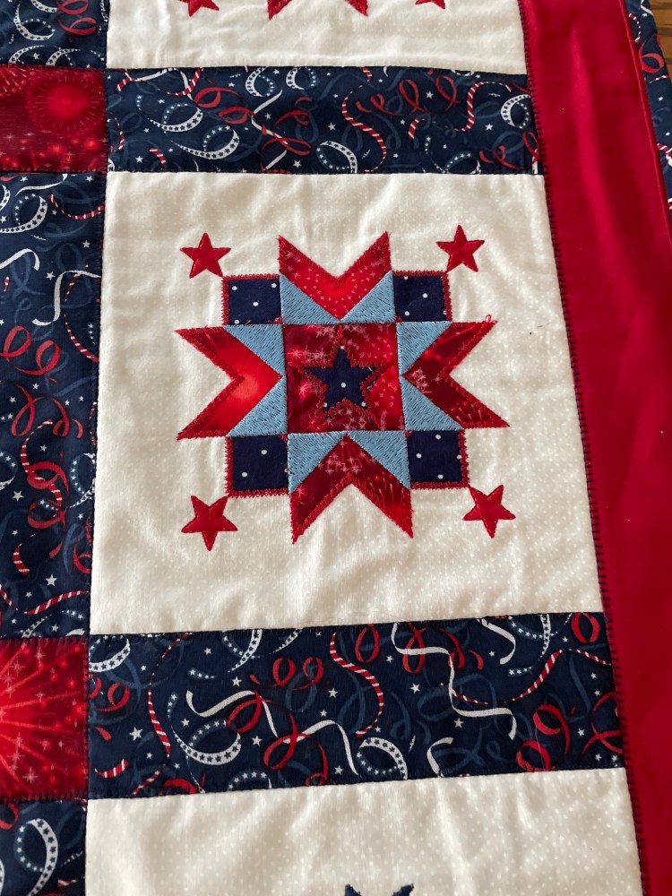 The blocks are applique and machine embroidery stars into a small 30×30” table decoration. A very festive quilt for the 4th of July! Robin used a technique called flange binding that she learned from Missouri Star Quilting Co. This is a simple and quick way to bind your quilts without having to hand sew! I personally love hand sewing, but if you are looking for a machine binding technique, this is a really awesome way to give some extra flair to the edge of your quilt. Her favorite part about this quilt was the machine embroidery. Beautiful quilt! May you all be blessed this week and happy quilting!