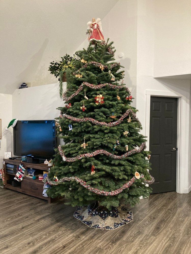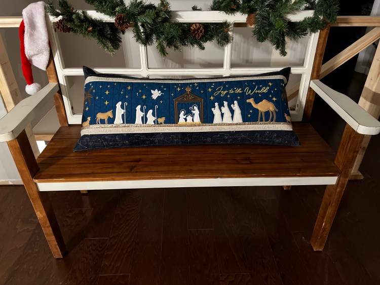 This beautiful Christmas pillow was made by my mom. We have matching ones! It is a Kimberbell pattern called the Nativity Bench Pillow. If you love applique, Kimberbell patterns may be interesting for you. Each panel is made in the hoop and then pieced together after quilting. It has fairy lights for the twinkle starry light. The large border is the scene from the town of Bethlehem, and the narrow border has the saying “Joy to the World, the Lord has come. Let the Earth receive her King.”
