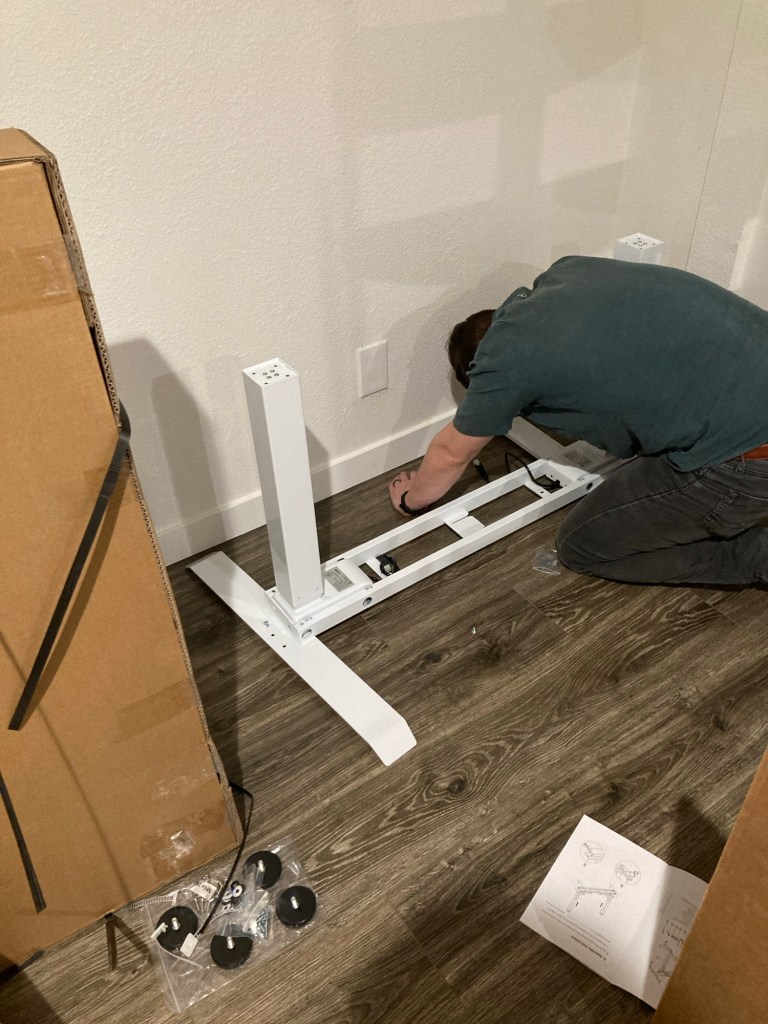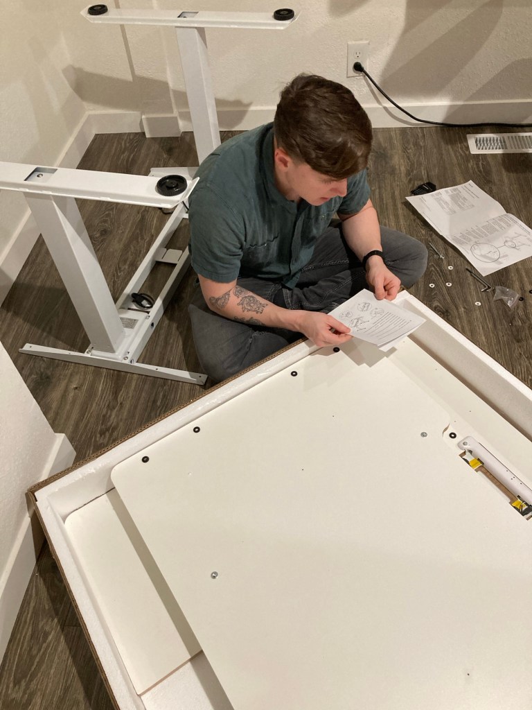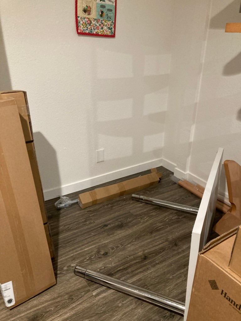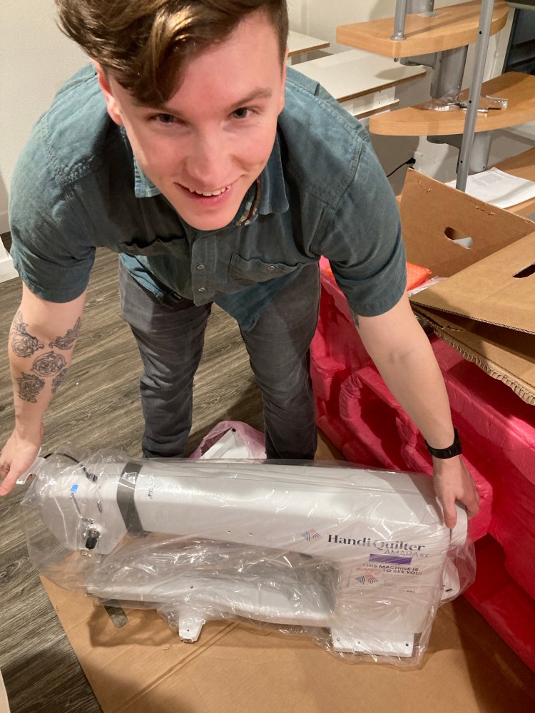 By now, must of us have made some kind of build-it-yourself furniture. Sometimes, the instructions are pretty straight forward… Sometimes they are not. Unfortunately, this lift table’s instructions were lacking in a few details and some tools. Thankfully, with the help of Zachary and his new tool kit, we were able to put the table together. Once that was complete, hooking up the sewing machine was pretty simple, though a two man job! I watched so many videos about this machine before I took my first stitch. The threading is more complicated than I am used to, and the technology is about 40 years newer than my Bernina 1260. To say it simply, I was scared to start!