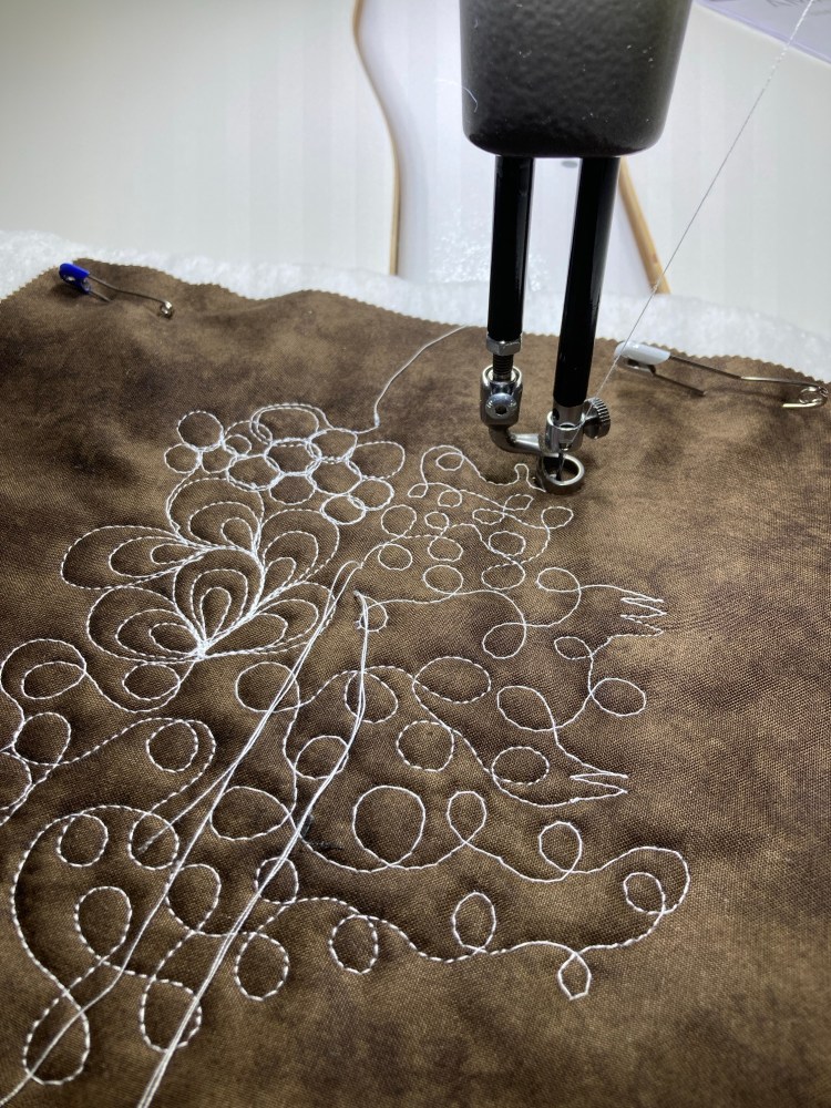 Through a few tears by me and constant patience and perseverance by Zachary who encouraged me the entire time, we managed to practice a few basic free motion techniques! Not too bad for my first time on this machine. We still need to work on some tension issues, but overall, I am extremely excited to continue practicing and start my first project. The regulated stitching is a cool feature that I have never had and will take some time to get use. You can see in the bottom right corner of this picture where the regulated stitches are. This makes the quilting look much cleaner than I can do on my own.